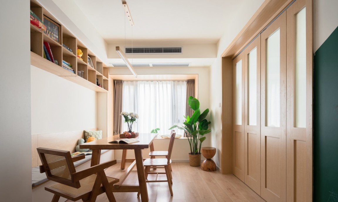 卡座、大板桌、飘窗形成了一个围合型空间,互动感更强,利用率更高,采光和通风也更好。整体以原木风为主,加入原木、布艺等元素,视觉上显得清新、简洁。墙面全部为白色,看起来简洁大方。
