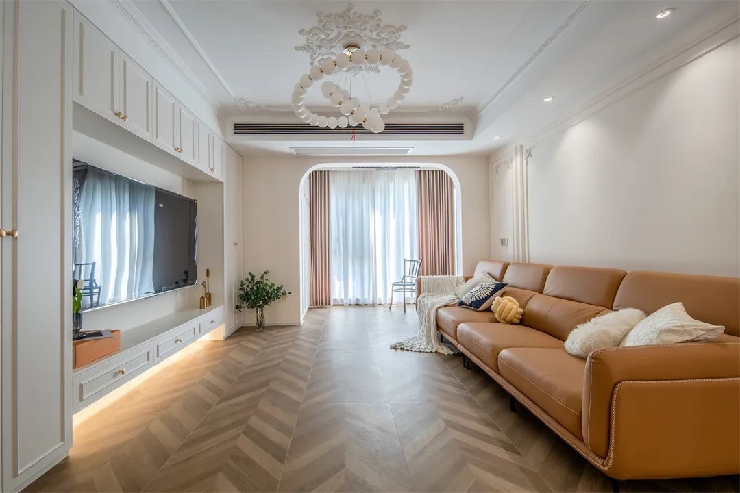客厅去茶几化设计,留出更为富裕的空间便于亲子互动,会客交流。纳入的阳台采用弧形垭口修饰,给人一种岁月般流动的复古感。