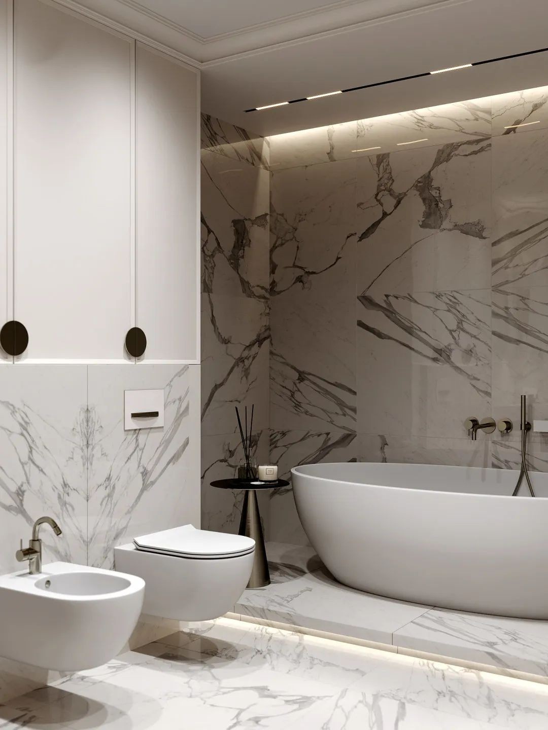浴室整体沿用了住宅的风格,大理石纹络淡化传统设计风格,隐藏式灯带将气氛烘托得温馨柔和,又将***气质凸显。