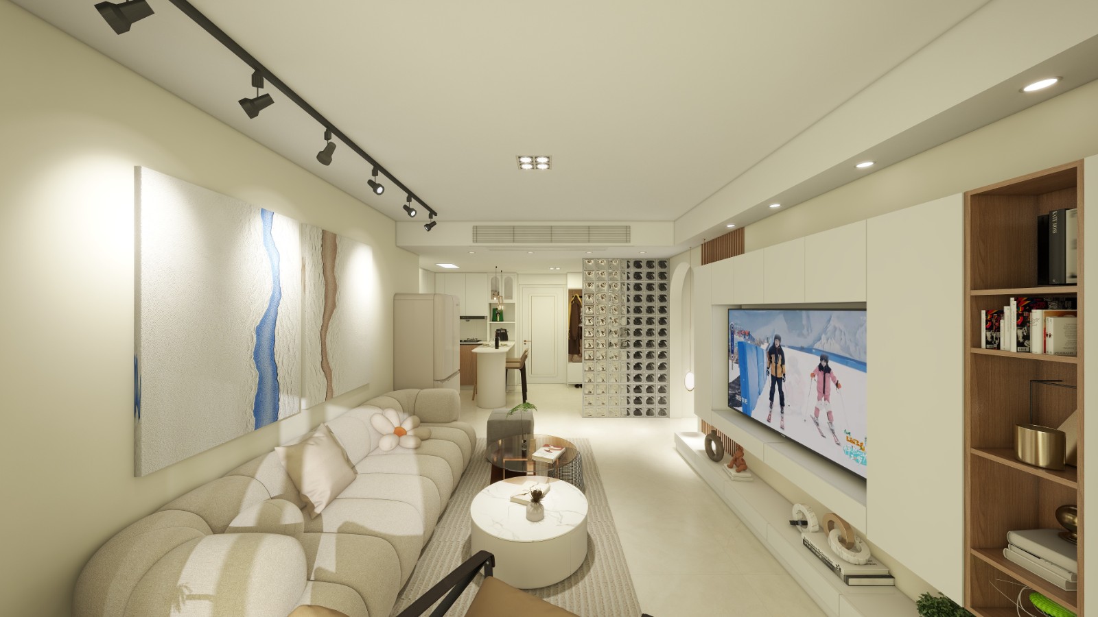 客厅进行了无主灯设计,增加空间感;玻璃墙做到了隔而不断的作用,空间规整了许多。