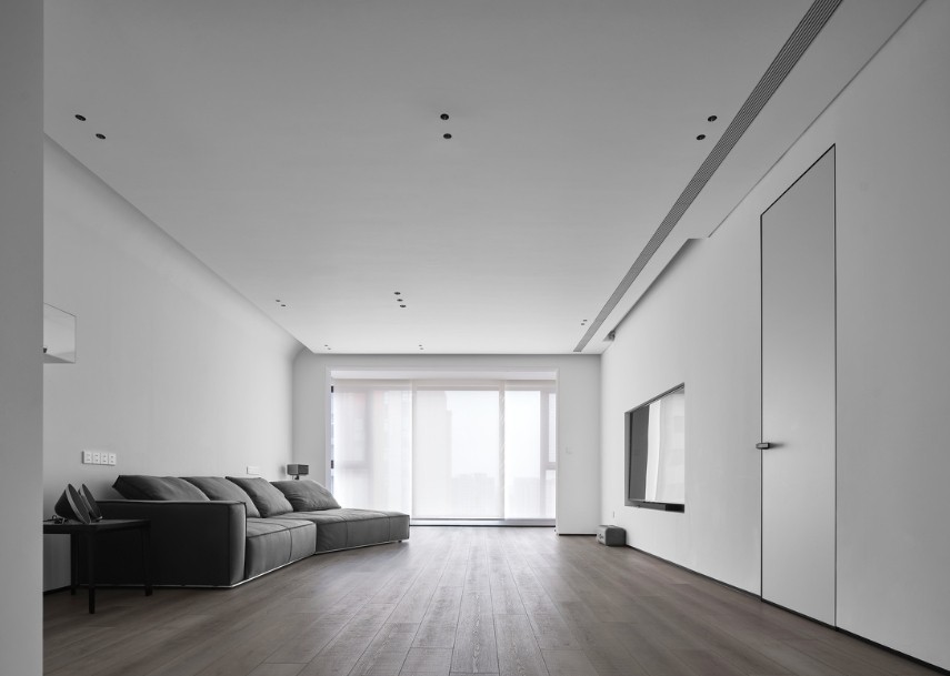 电视背景墙是内嵌式的,上方吊顶区内嵌设置投影区实现空间的交叠功能。墙体大面积留白,创造简约的空间表面。内嵌的踢脚线设计墙体不落地突显体块感,与地面留有一定距离,视觉上更加轻盈。