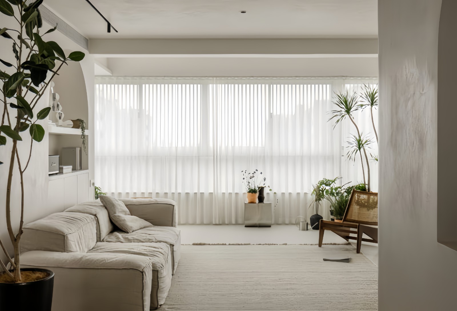 客厅整体布局以减法为主,沙发从色系上融入空间底色,搭配同色地毯,视觉上清简且宁静, 而在材质上为空间增添更多柔和气质,亚麻布艺沙发、羊羔绒地毯,给予家里的小朋友一个更为无害且安全的活动区间。