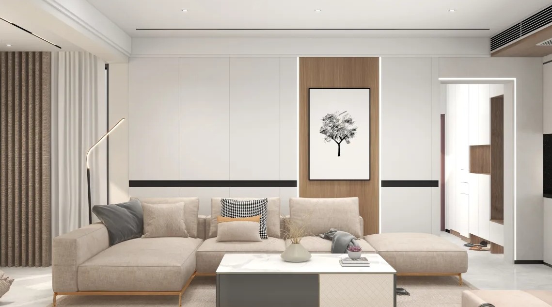 进门入户的位置,设计师刘丽用悬空的端景柜结合镂空的墙体,做了一个半开放的玄关,不会进门就看见沙发,也让光线透过来不会让入户很暗。