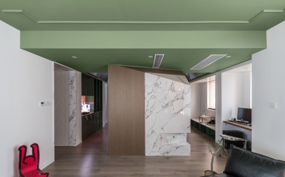 吊顶利用简单的石膏线塑造复古的氛围感,浅绿色的顶面和墙面层次分明,复古而清新。空间真正的灵魂在于色彩和材质赋予空间的不同氛围,融合彼此之间带来的不同感受。