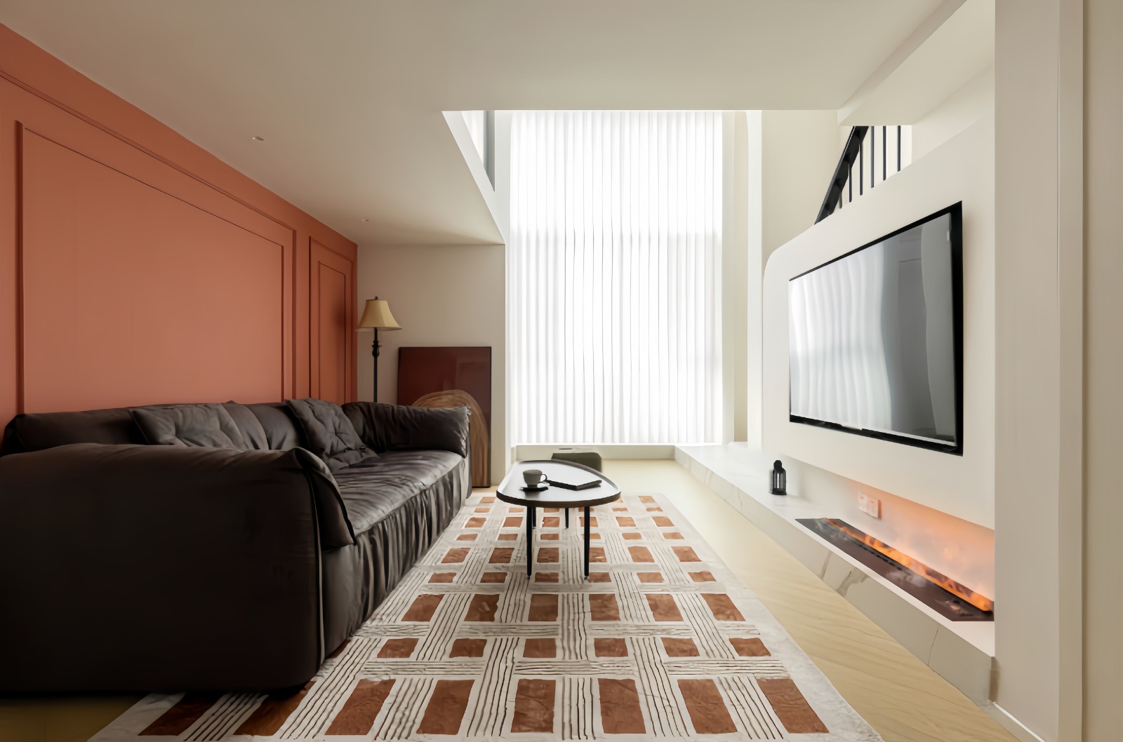 挑空后的客厅采光一级棒,改动后的楼梯位不占地方,让客厅活动空间变大。电视背景用石膏板墙做的造型,电视机尺寸提前告知,做到全部嵌入的感觉。一侧是收纳高柜,因为后面还有楼梯扶手,所以在考虑背景墙的设计时,我们做了简化的设计。