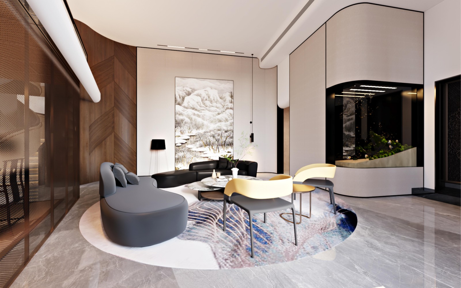 接待空间由木饰面、金属、石材构建,空间干净整洁,其背景墙以名画装潢元素,展现艺术相容的美学核心理念。自然的纹路融合了金属的光泽度,使接待客厅具有了透亮清爽以及大度的气场。