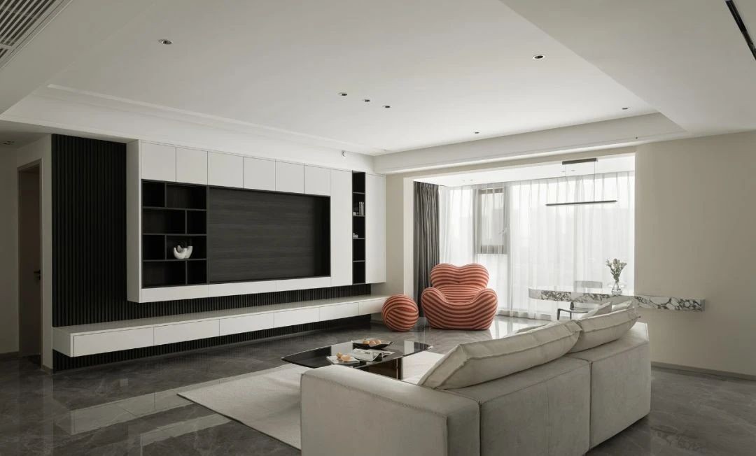 客厅电视墙以黑色木格栅作为基底,定制悬空电视柜,有藏有露更加美观实用