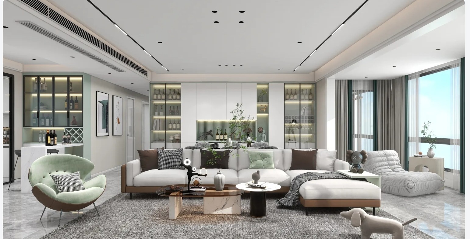 本案例营造了现代清新、脱俗的生活氛围,其中绿色作为空间的核心要素,满足风格延续的同时,也兼具了统一的空间感。客餐厅中,白色大背景之下的绿意点缀,结合落地窗实现明亮开阔的视野;卧室中,绿色则成为主要背景,为生活带来森系的浪漫。