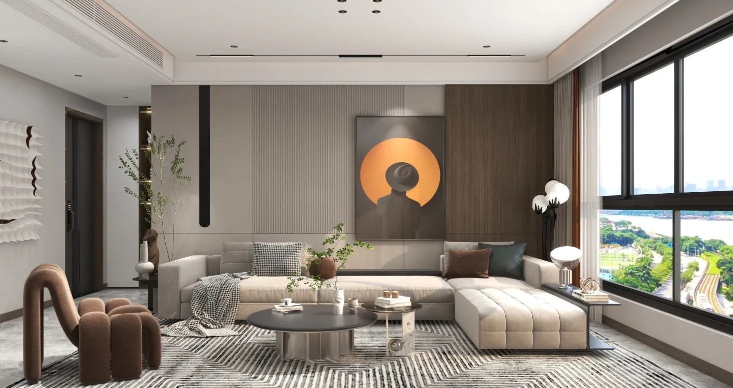 于方正之间融入现代家居理念,无主灯客厅布局规整却不失肆意自由的生活姿态。空间中一抹暖橘画饰带来鲜亮氛围,棕色系的单椅与格栅装点则为日常铺垫着端庄与典雅气质,让生活也就此覆上一层温馨色彩。