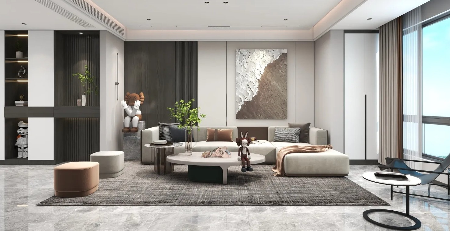 在客厅中营造轻奢简约的***质感,装饰一幅肌理油画,层叠细节更显精致;布置灰白布艺沙发,干净利落的组合彰显优雅姿态;一白一棕单椅置于茶几一侧,平衡空间色彩之余,也能满足日常待客所需。2 黑白经典搭配从不落俗套,在客厅电视墙的设计上,以白色岩板作为电视背景墙,黑色电视以及黑色的格栅打底,重叠的黑白予以空间鲜明的对比,营造出舒适而凸显档次的空间氛围。简约***的空间布局,温暖色彩的细节点缀,让用餐时分也充