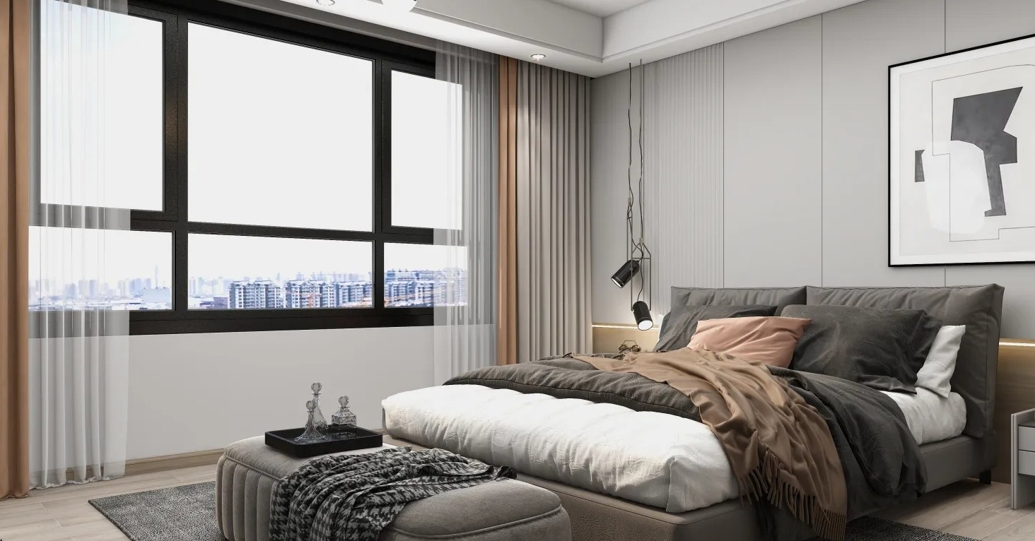 主卧布置灰色床品,呼应同色地毯与床尾沙发凳,居于中位的深色布局也让空间显得典雅而稳重。床尾靠墙处搭配白色矮柜,一幅艺术装饰画缀于一侧,角落再布置几株绿植,整体文艺而清新。