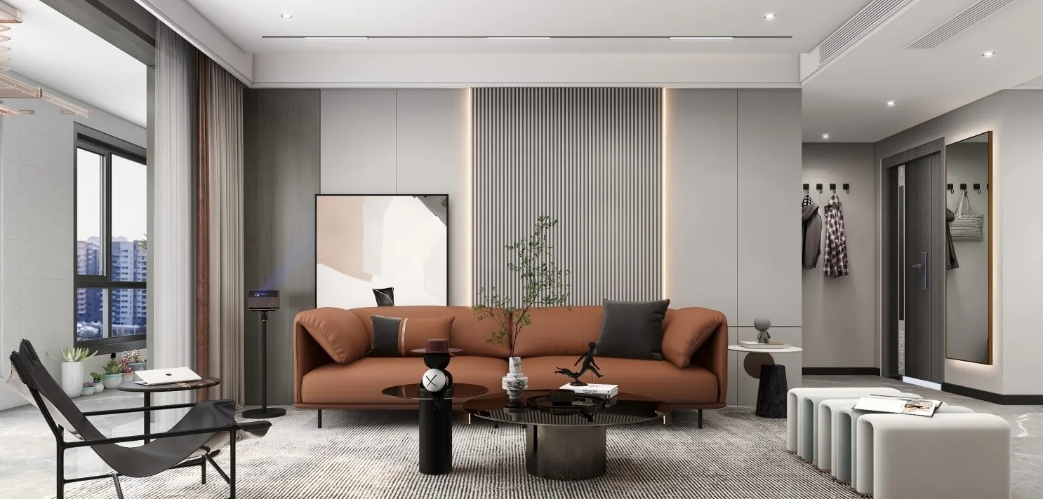 客厅中的超大落地窗使阳光透过窗户 映入以灰色为主基调的空间中 为室内带来明亮空旷感以及生活的简致***氛围 在空间中心布置上焦糖棕皮质主沙发与U型拼接座椅组合 暖色调的应用打破了空间中色彩上的审美疲劳 而背景拼接式的对称设计搭配细密格栅、暗设灯带 以及浅色温柔配色下的几何艺术画框,细节的变化中 赋予了空间更加灵活的韵律感,在此也营造出轻松的生活状态, 客厅是一家人可以真正共处、交流、放松的空间 设计