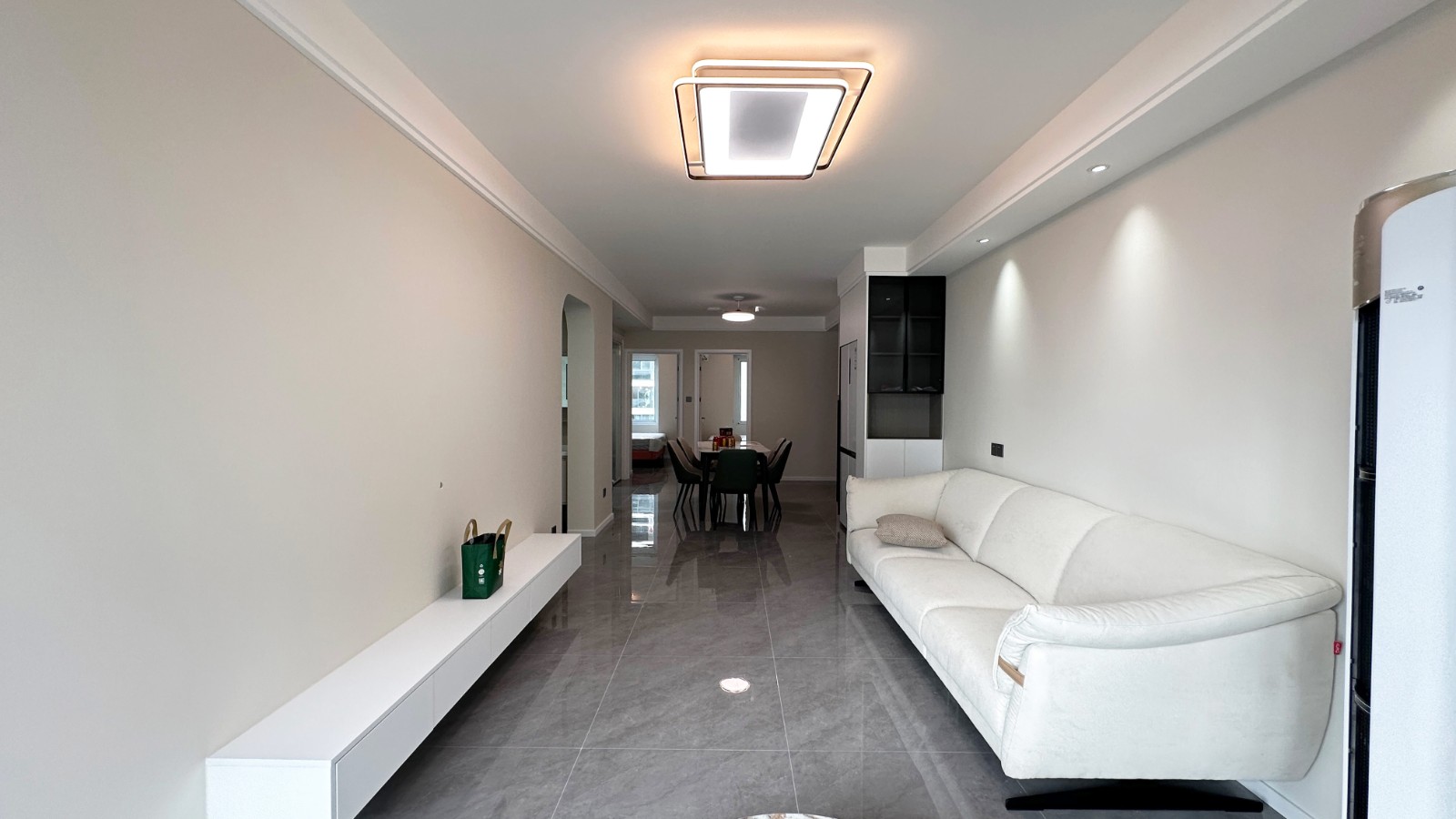 客厅太阳透过玻璃窗,点亮屋里的每一个角落,同时也照出了温馨的家居生活。将阳台纳入客厅,改善视觉通透感,扩大活动空间。