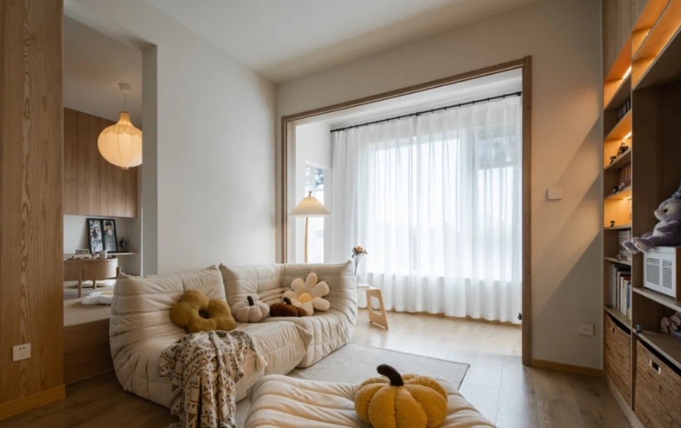 客厅的毛毛虫沙发也是一开始就选好的,没有搭配大茶几,一个灵活的边几足够使用。