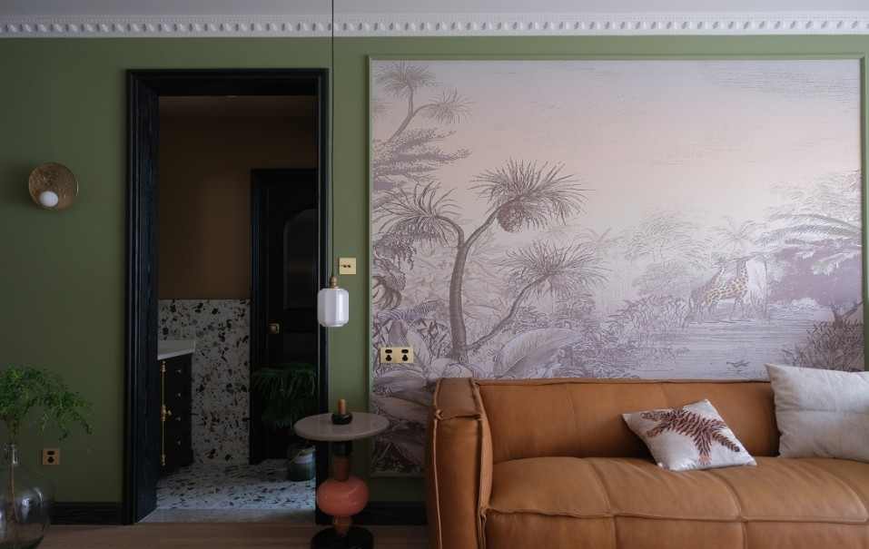 中性色系里的暖灰色的壁纸和暖黑色木制品搭配一点黄铜色,使环境主色调的草绿色显得静谧而诗意,暖色系的焦糖棕色沙发及桌椅、部分墙面控制在了一个合适的比例。期间的反复斟酌和比对色卡,是只有装修过的人才懂得辗转反侧。