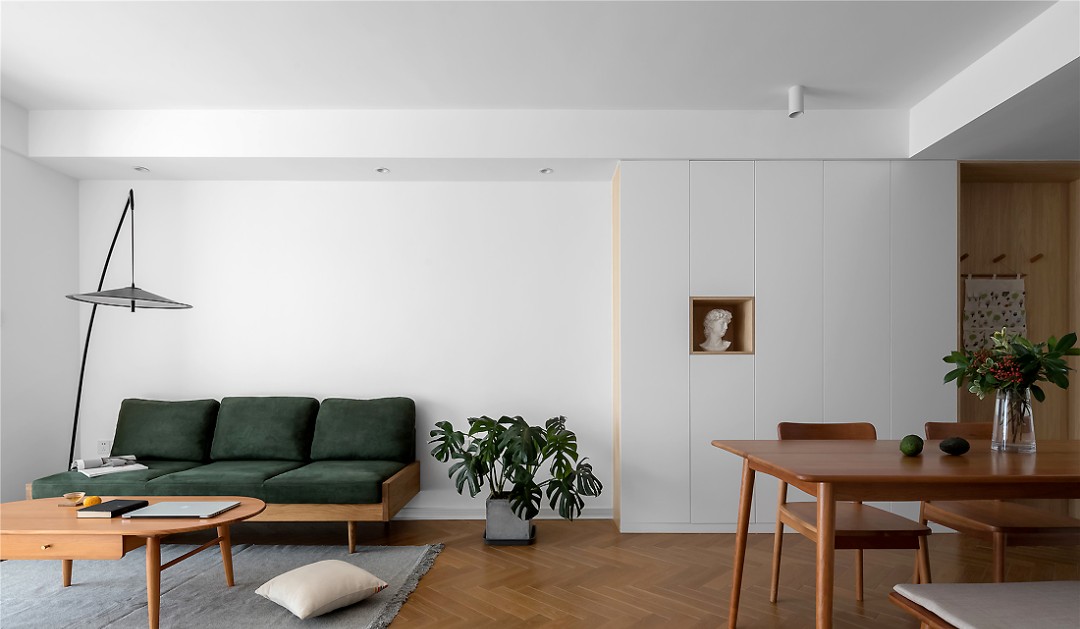 客厅,原木色茶几和地板富于自然气息,墨绿棉麻布料装饰着沙发和绿植,带来清新靓丽的氛围。