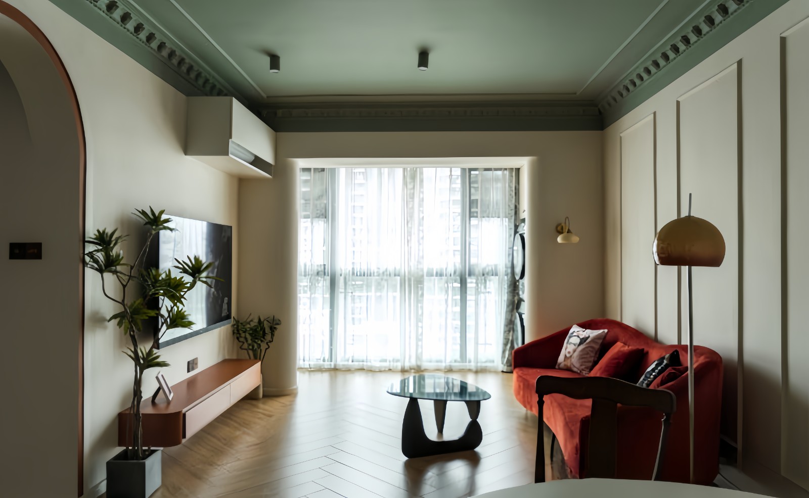 电视柜和电视机和过道的两个拱门一起的划分着空间立面的比例,在视觉上达到一种平衡。为了不让家电在风格化空间中显得格格不入,给空调挂机设计了一个“家”,视觉上确实弱化了很多。电视柜通过悬挑的方式,表达的是简约的形式;同时悬挑对于日常保洁比较方便,也不会因为落地看起来比较占地方。
