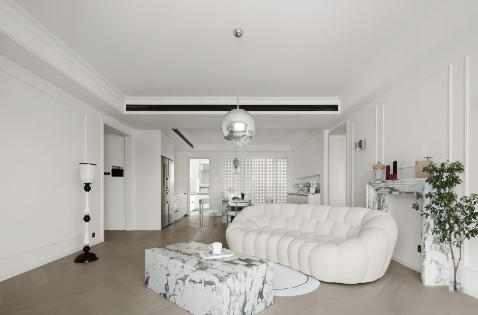 无主灯的设计手法,搭配精致利落的吊灯,充溢着法式摩登的干净优雅感,大面积的留白为空间赋予了更多的情绪张力。折叠洞洞板窗户更加灵动独特,增添了宁静雅致的氛围感。
