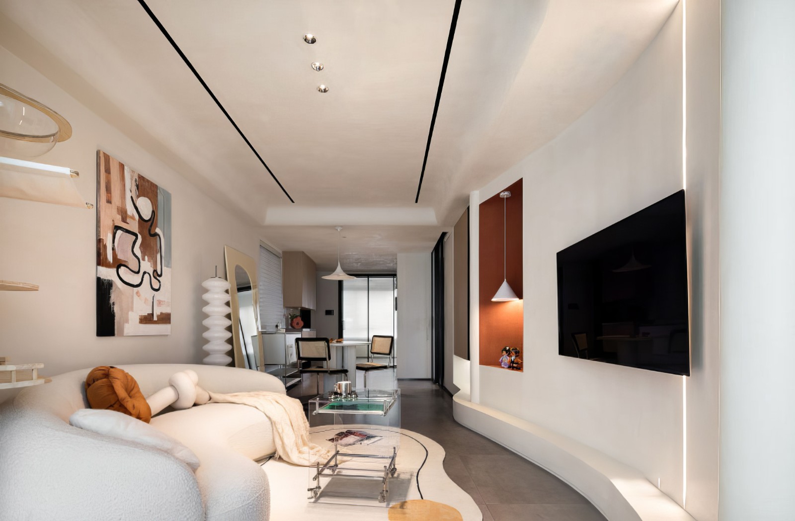 客厅与阳台的墙体以及吊顶均做弧形处理,使空间散发出一种独特的舒适,电视墙一侧打造壁龛,饰以绛红色,安装吊灯,各种元素交织在一起,日常增添了一份柔和治愈的氛围。