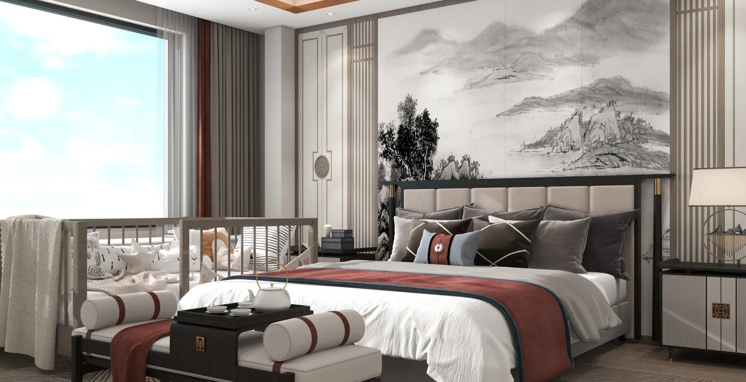 卧室给人的整体印象是端庄而优雅的,背景墙简约中式元素对称布置,中间一幅水墨山水画奠定古典温润的空间氛围,再加之砖红色点缀、植物的烘托,不需繁复的装饰堆砌,自然而然中便是质感生活的呈现。