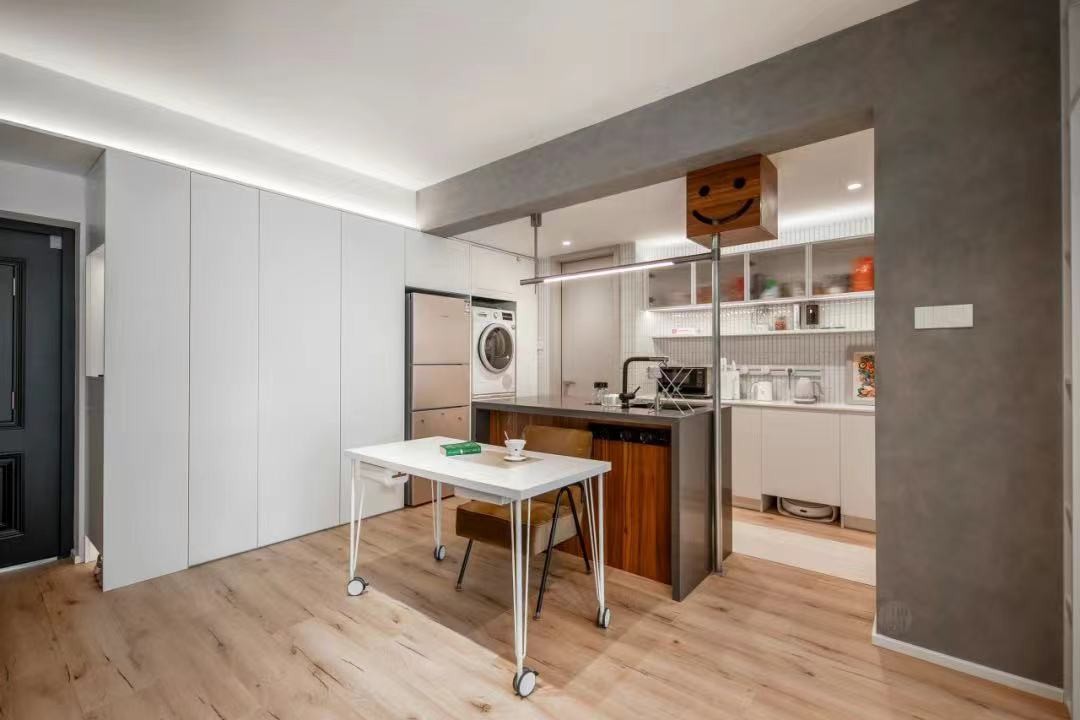 厨房设计半开放式厨房,加岛台,洗衣机和烘干机以及冰箱放置一侧
