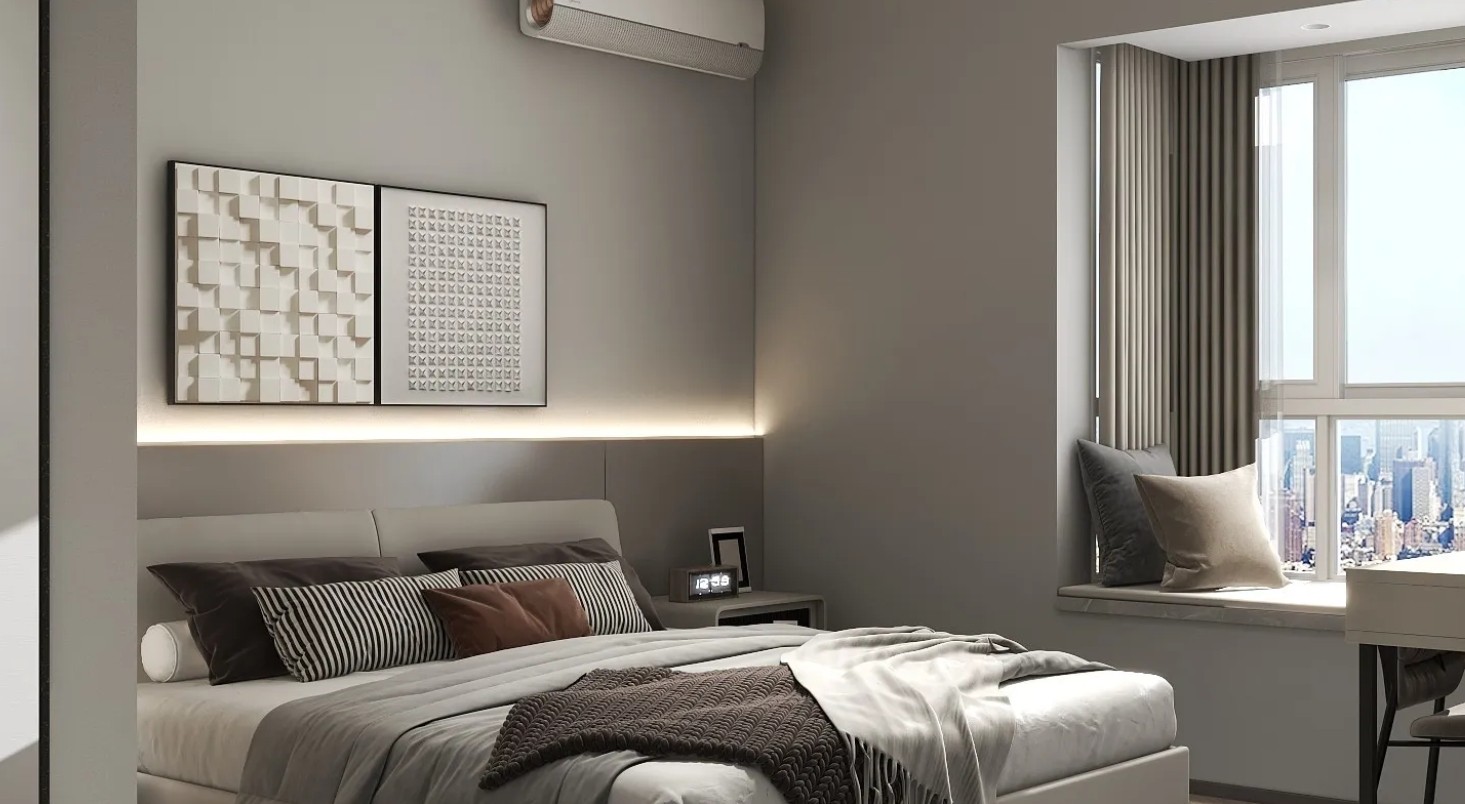 主卧空间设计灰色为整体的设计主调。床头柜和衣柜做一体设计,挑空的衣柜形式处理别具一格,同时过道空间设计整面的衣柜增加了整体的储物空间。