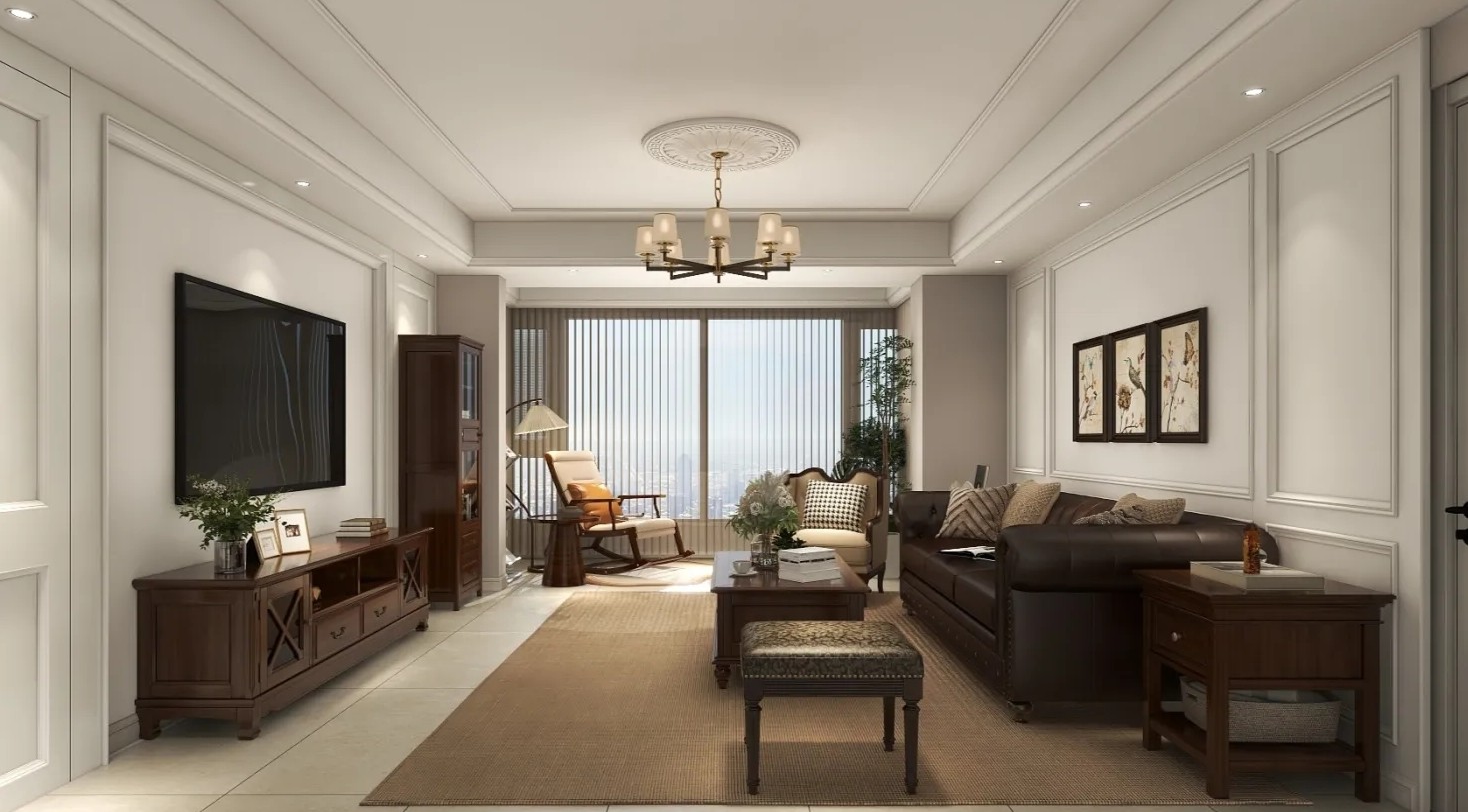客厅的空间增加了深色的家具空间,浅色的护墙空间设计搭配深色的空间,功能性增加同时增加了空间层次感。
