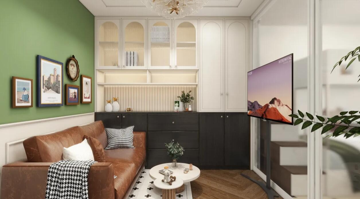 客餐厅采光不是很好,中间有一道梁很低,在这里我们做的辅助灯光,2.47米的层高显高的前提下,还能增加光源和氛围感。业主收纳需求很多,客厅做了大的收纳柜,玄关收纳