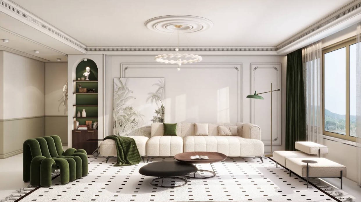 电视背景墙依托承重墙打造出别具一格的独特造型,用石膏板做出弧面,靠主卧门洞一侧的弧形收边内部安装氛围灯,视觉上好似一面独立的墙,简约的设计尽显几何之美。下方抽屉柜为客厅收纳做补充,一半嵌入弧形造型墙之中,另一半则采用悬浮式设计,视觉上更显轻盈。