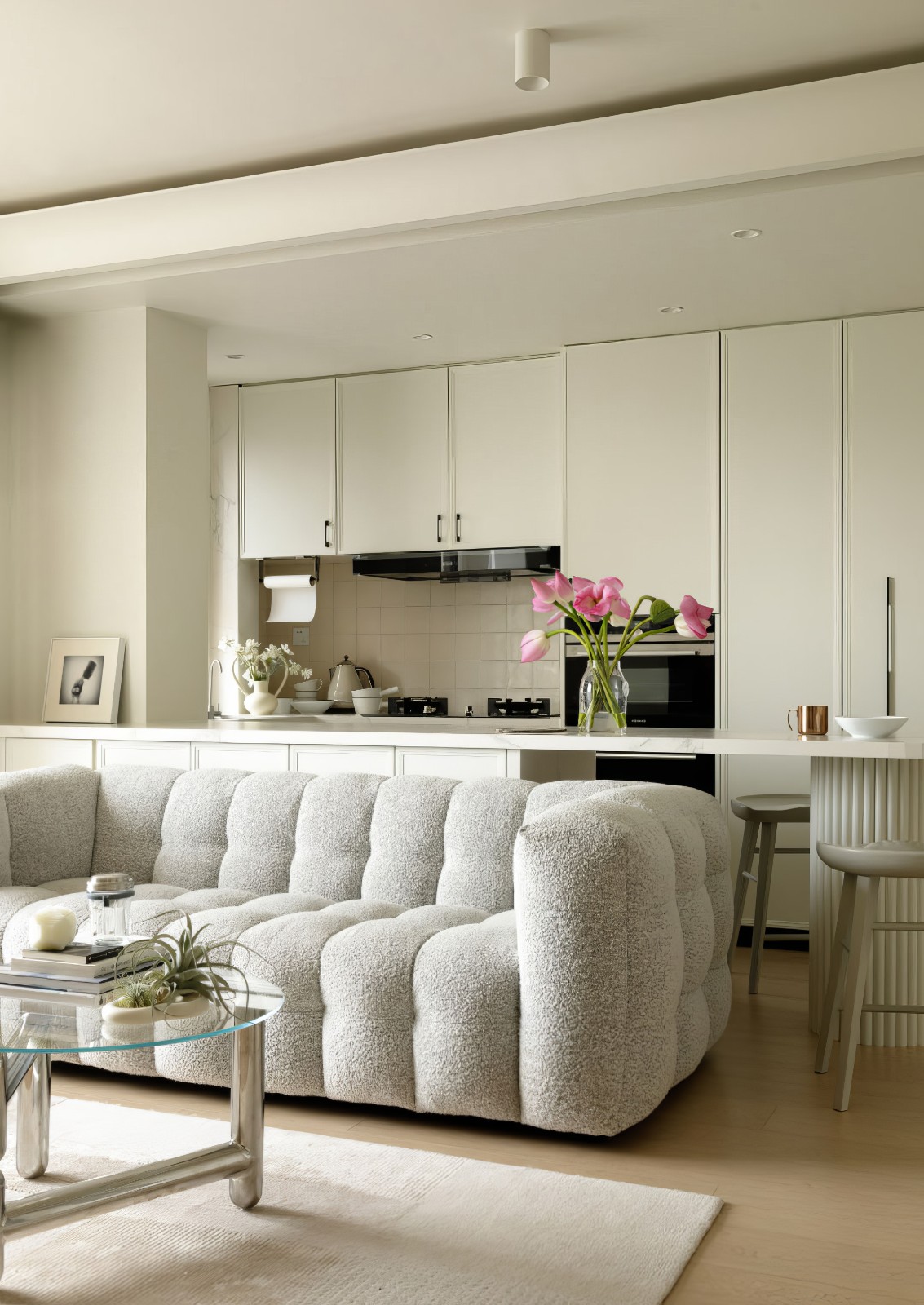 宽大的法式云朵沙发、短绒奶茶色方毯、金属架的玻璃茶几,软硬交叠出现,清透与厚重同时出现,打造空间的极度舒适感。