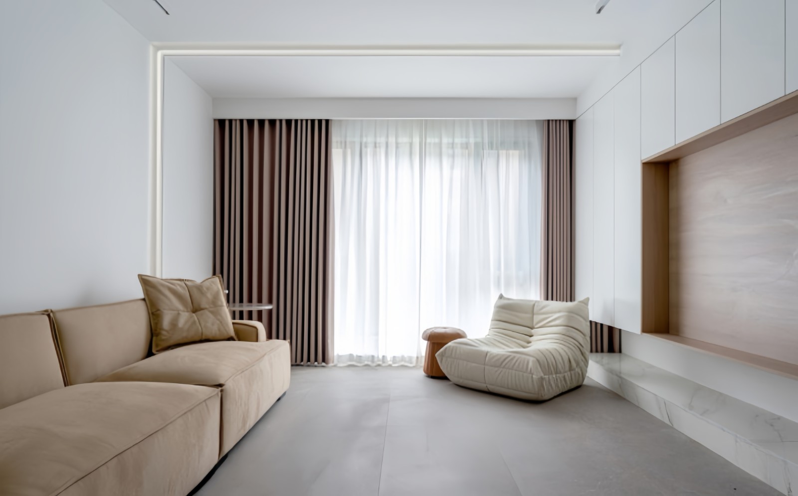 纯白色的客厅中,简单的局部搭配无主灯设计,营造出纯净的极简风。无把手柜与柔软的方块沙发,让空间线条感十足。