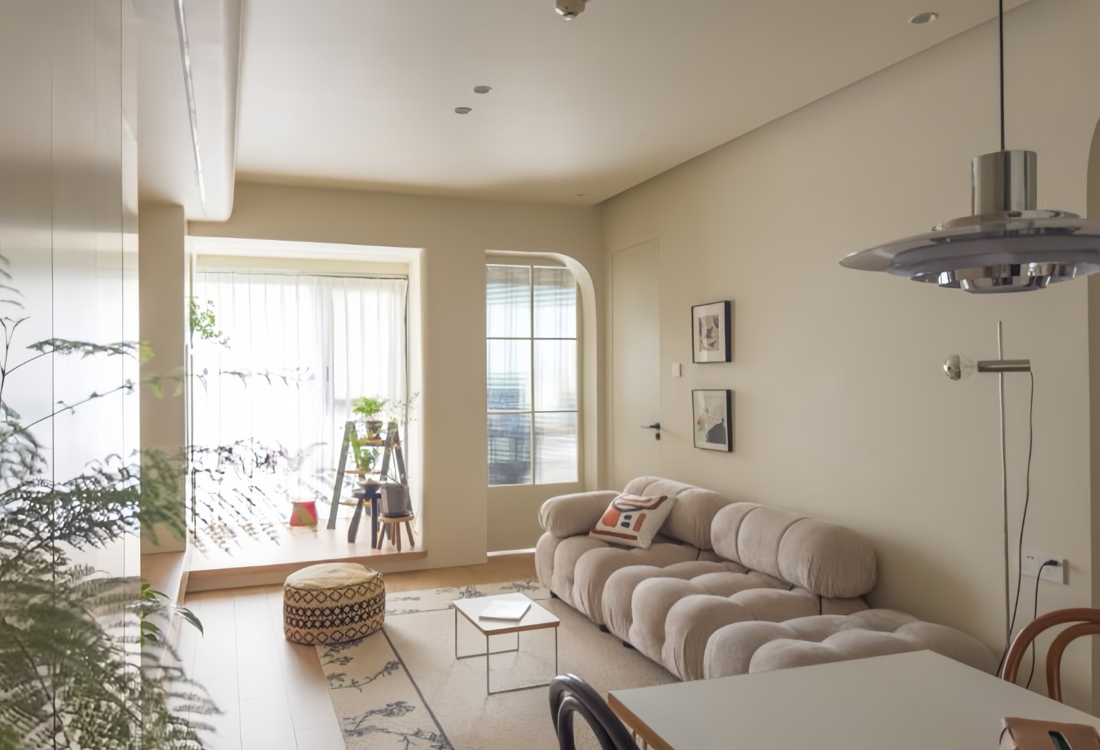 纱帘和玻璃门的灵活隔断保证室内自然采光和通风,空间大面积浅色做膨胀色,搭配低矮家具与绿意装饰,扩大视觉感受,营造通透且舒缓无压的休闲空间。