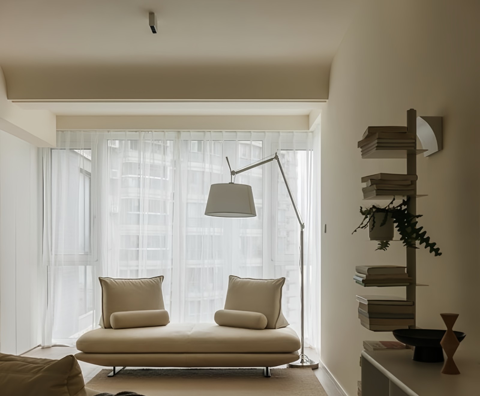 去繁就简,打破客厅“常规化”,打造以书为中心的家庭活动区,同时容纳阅读、学习和相互交流的亲子空间。居室一隅用弧形元素柔化边角,增加趣味与灵动。