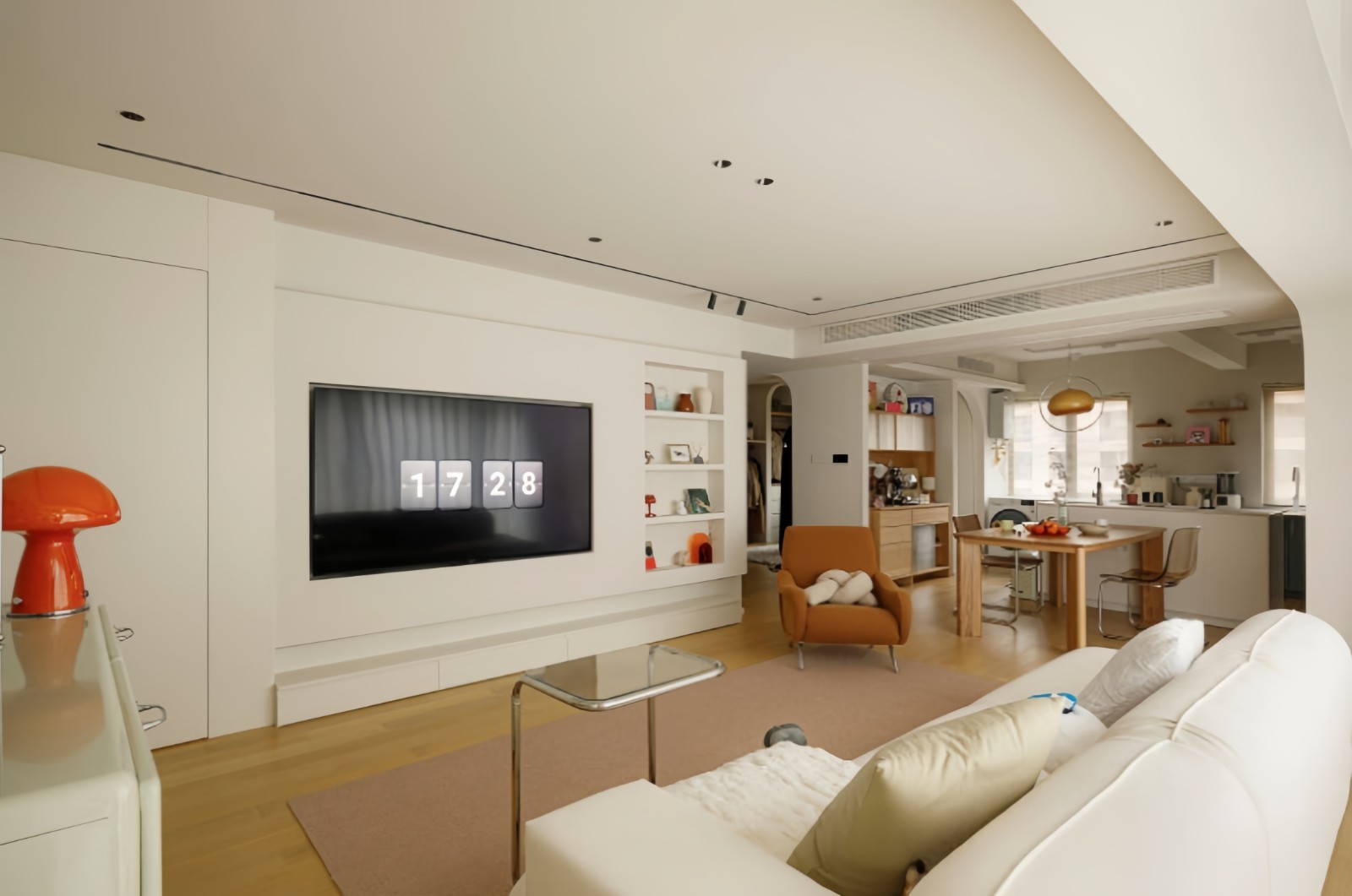 客厅视角,我们打通了原本的阳台,重新调整了沙发以及电视机的位置关系,拉宽了客厅的横向深度,得到了相对自由开放的起居室布局。