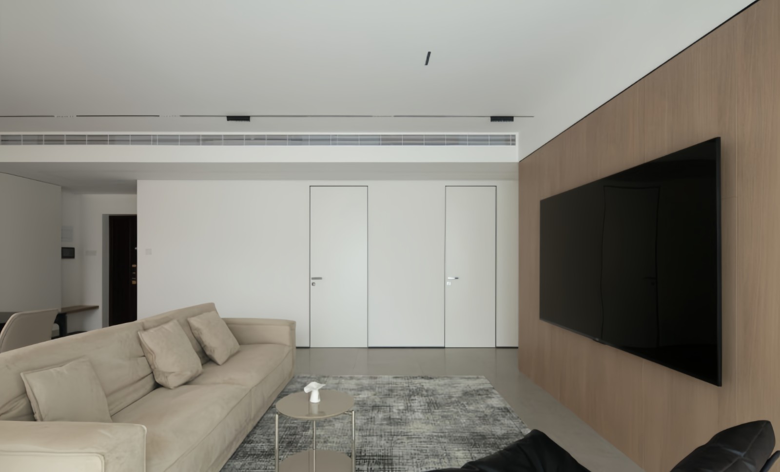 客厅与书房之间安装一扇可隐形口袋门。 更值得一提的是,电视墙加厚屋主可以将游戏、电视设备隐藏在电视后面的空间,让客厅更具多元化功能。
