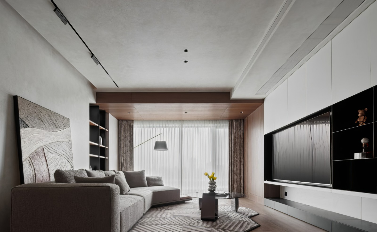 电视柜确定了空间主调,而相邻大范围木饰面运用,材质和色泽上构成拼接反差,让自然的气息由顶面至地面倾泻而下,注入如大地般的厚实温暖。