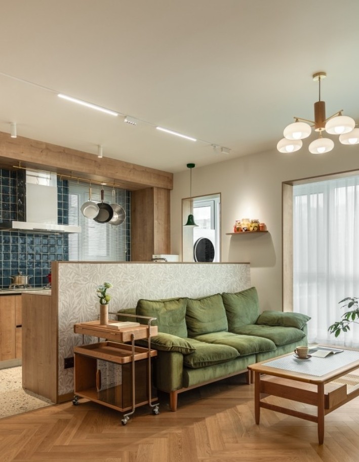 客厅与餐厨空间相互连通,整个空间设计得温馨而舒适。地板采用木色的人字拼地板,家具则以木色为主,让绿色的沙发在空间中更加醒目。