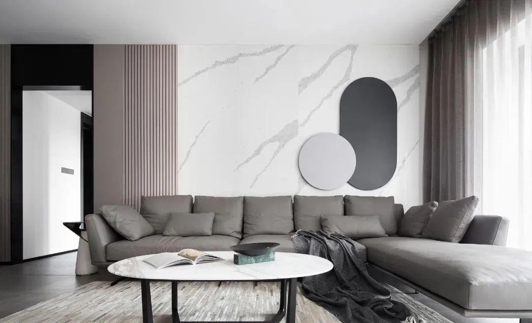 ▲ 深灰色L型真皮沙发,搭配浅灰色窗帘和浅灰咖色几何图案地毯,背景墙由清晰纹理的浅色岩板+灰咖色木格栅及硬包构。成,一对圆形铁艺相互叠加凸显局部亮点。