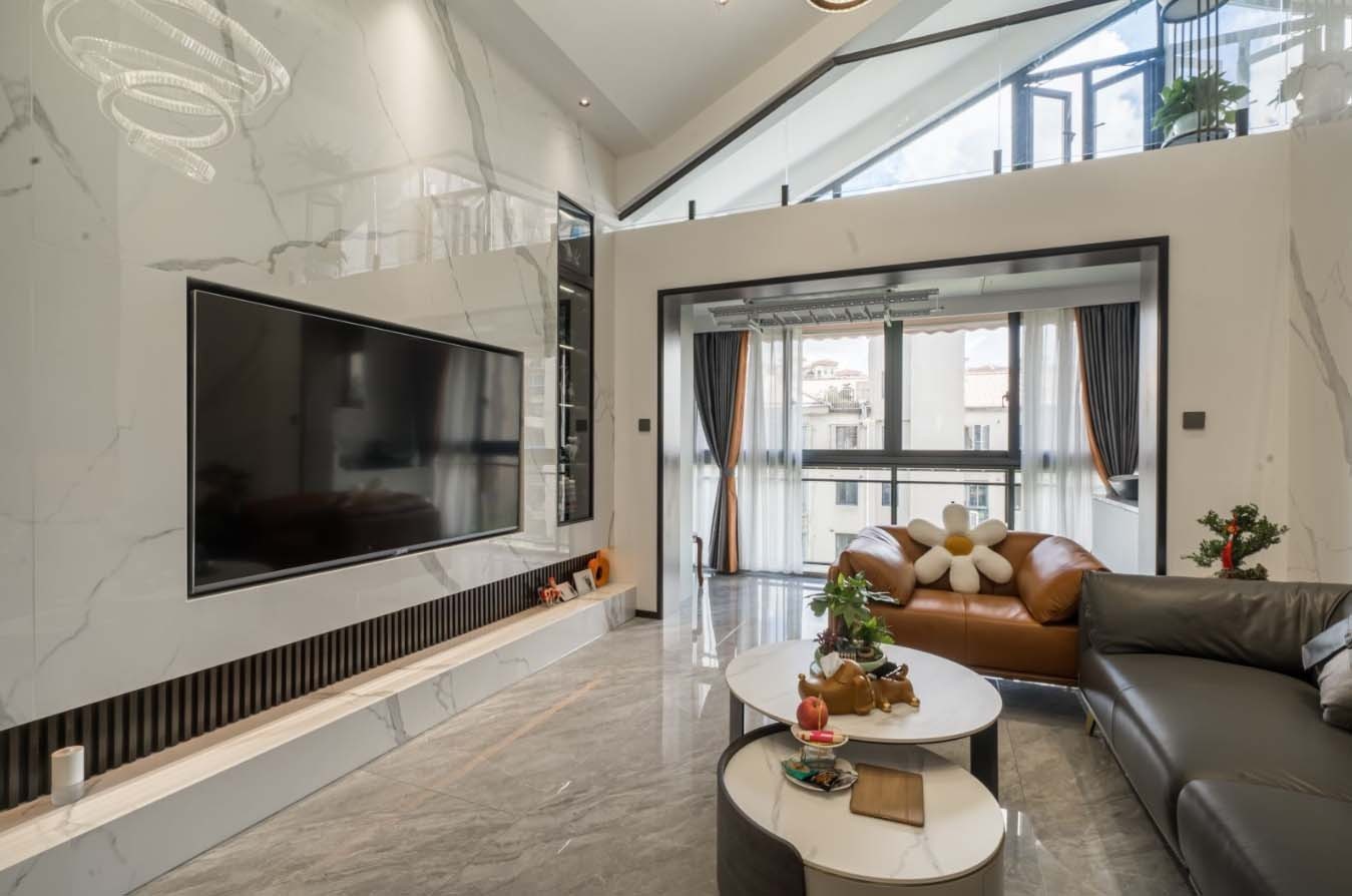 客厅上方的挑空有5.4m高,两层高的落地窗,明亮透光。城市轻奢生活与现代精致的完美共生,视觉盛宴与触觉张力里展现出业主纯粹、细腻的生活方式。