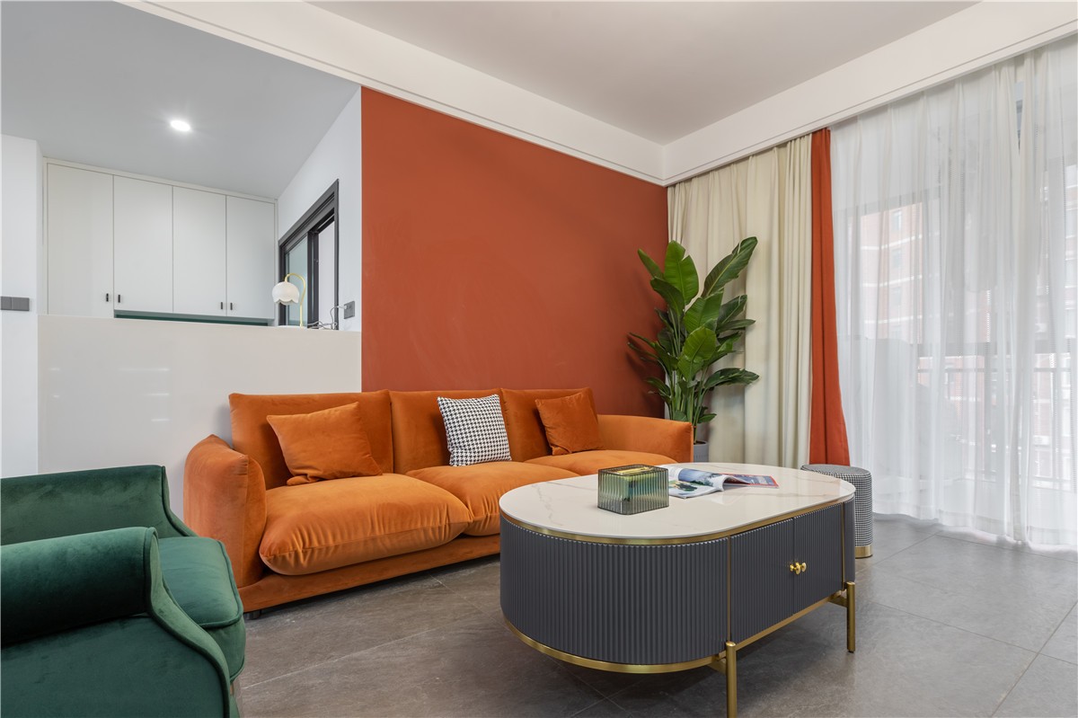 客厅整体以亮色调为主,给人非常清新自然的感觉。地面通铺灰色地砖,增强了整体质感。大落地窗的设置,更显一份静雅,通风和采光都很充裕