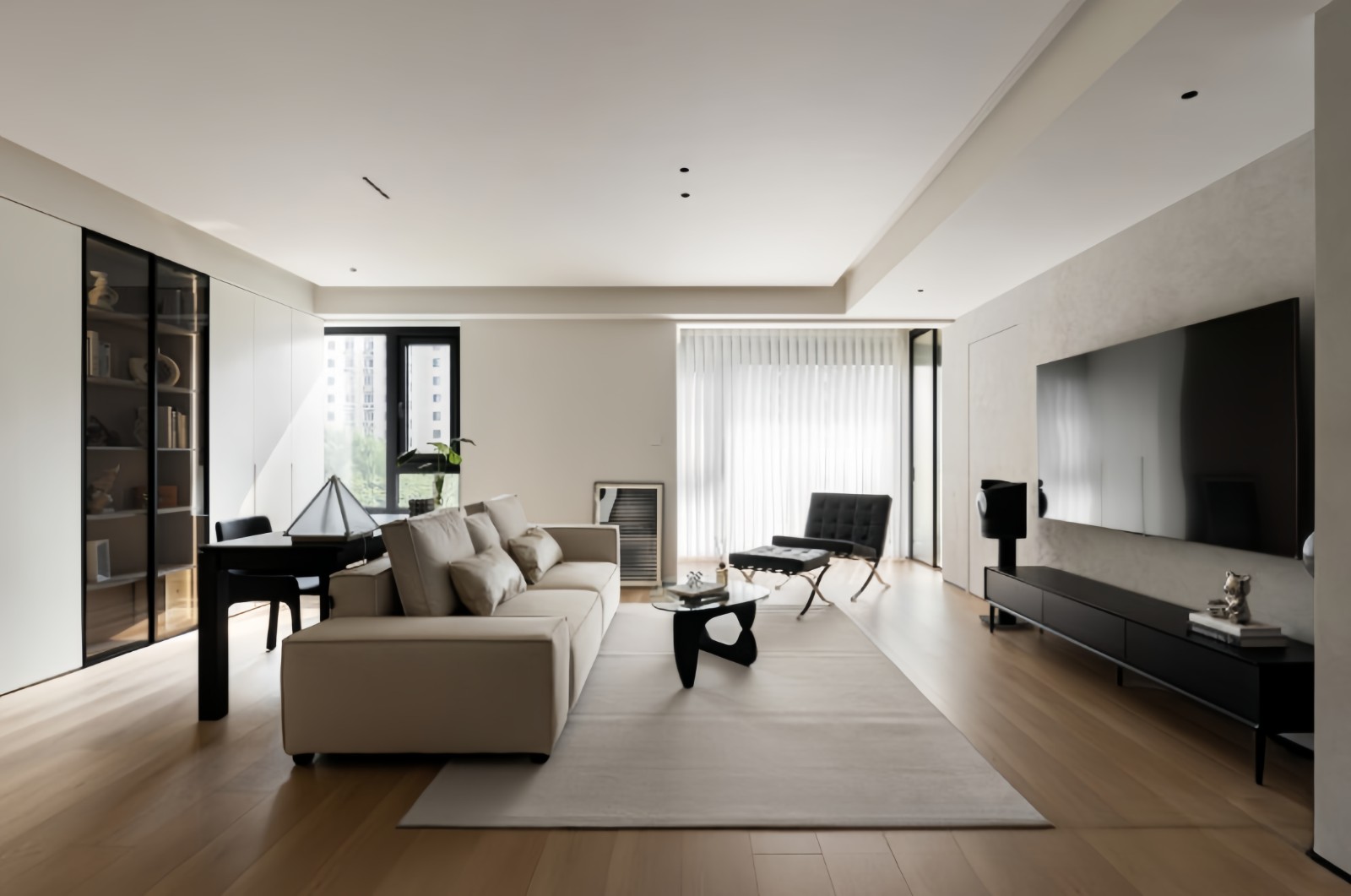 整排的书柜以白色作为主色提亮空间,用黑镜玻璃的透明展示柜区分跳色,减少柜子给空间带来的填充压抑感,反而增加空间层次。