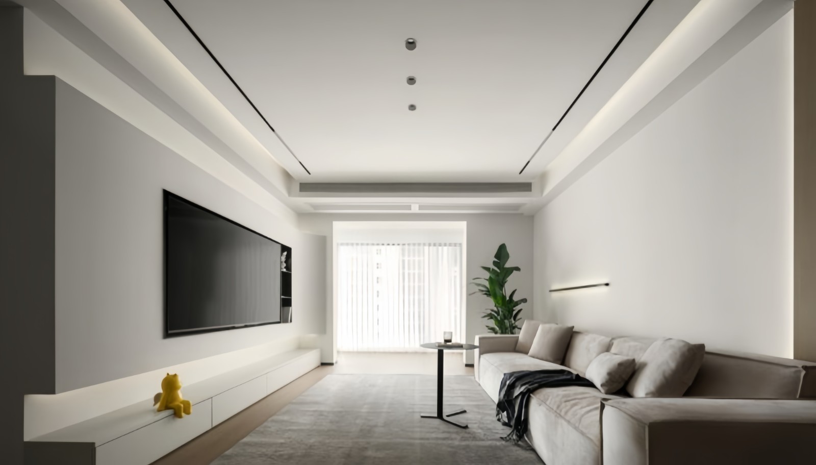 客厅左手边是公共区洗手间,为了视野更加通透,将其干区外置与走廊连通。 电视墙尺寸较短,视感上容易显的局促,所以没有选择电视柜形式,而是做上下留空设计,搭配嵌入式灯带,增加轻盈灵动感,侧面以曲面过渡转角,线条延伸增加层次感,视感更加柔和丰富。