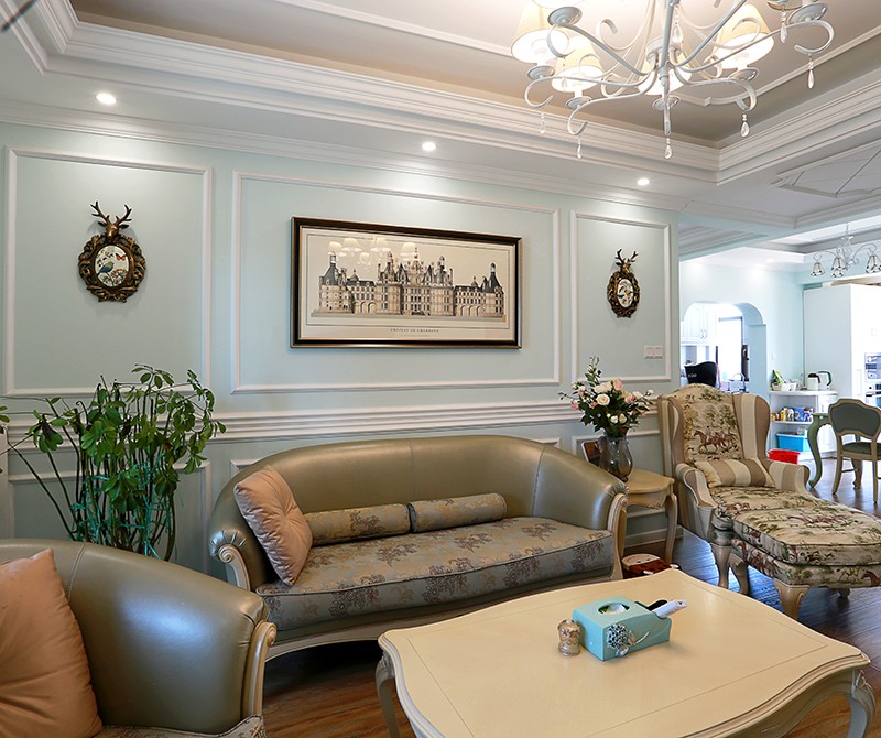 客厅主色蓝绿,附合着大面的米色营造出一种清新,舒适的环境,再以白色叠级线条丰富造型,增加美式风格的趣味性。