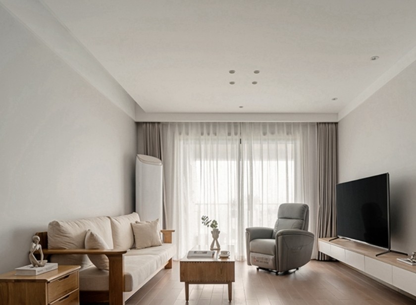 满吊顶无主灯设计搭配奶油色背景墙,奠定了客厅简洁、淡雅的空间基调;通铺的原木地板又将空间的清冷中和,融入家的温馨。