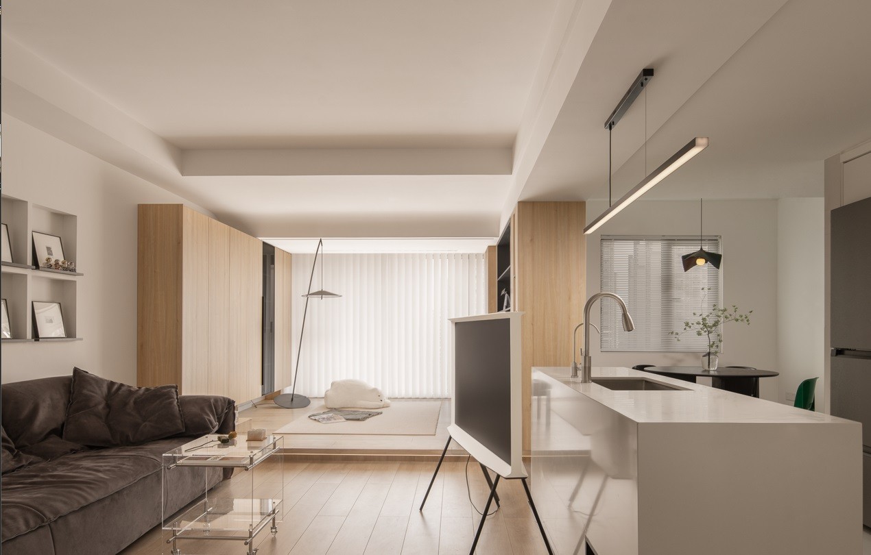 开放式的设计,一进门视觉上就感觉通透大气。空间各自独立却有着整体的功能连接。 整体木色与白色的搭配简单且温暖,加上绿色软装与绿植提升自然氛围。