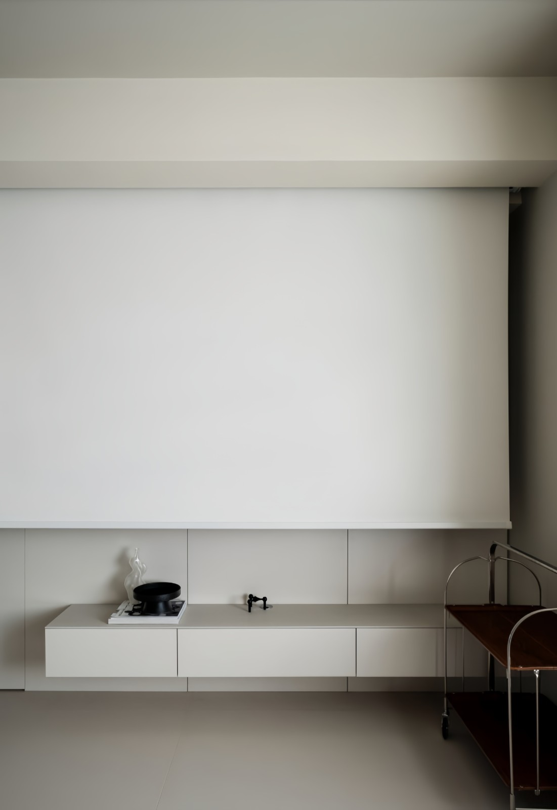 取消了电视墙的常规设计,将主卧室门和墙面做墙板隐形门,匹配悬空电视柜,墙板及抽屉分缝细节对应整齐,结合原有梁位留出投影幕布空间。