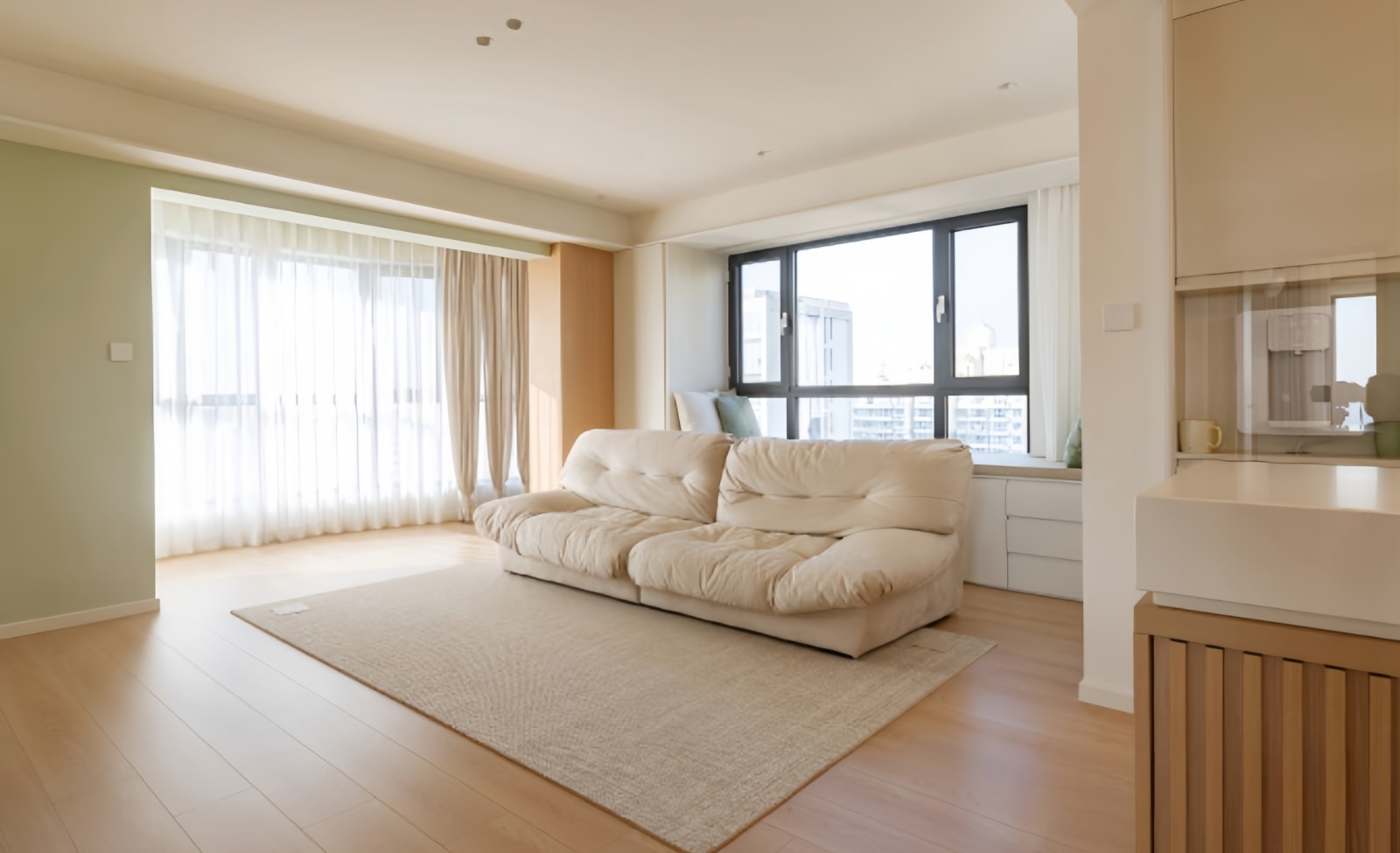 客厅整体墙顶面通刷的白色墙漆,垭口用原木色木饰面和牛油果色做出结构感,不像是通往阳台的垭口,减弱阳台和客厅的空间区分感