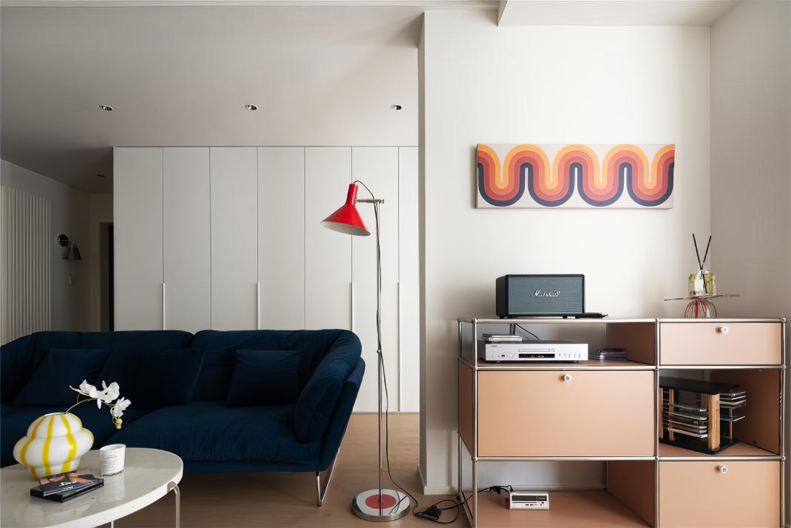 沙发后的区域预留了足够的空间,紧靠小卧室打造出了一整排的储物空间,到顶的柜门整体感很强,内部则是鞋柜和储物柜的组合,是玄关储物的延伸,也提升了客厅区域的收纳功能。