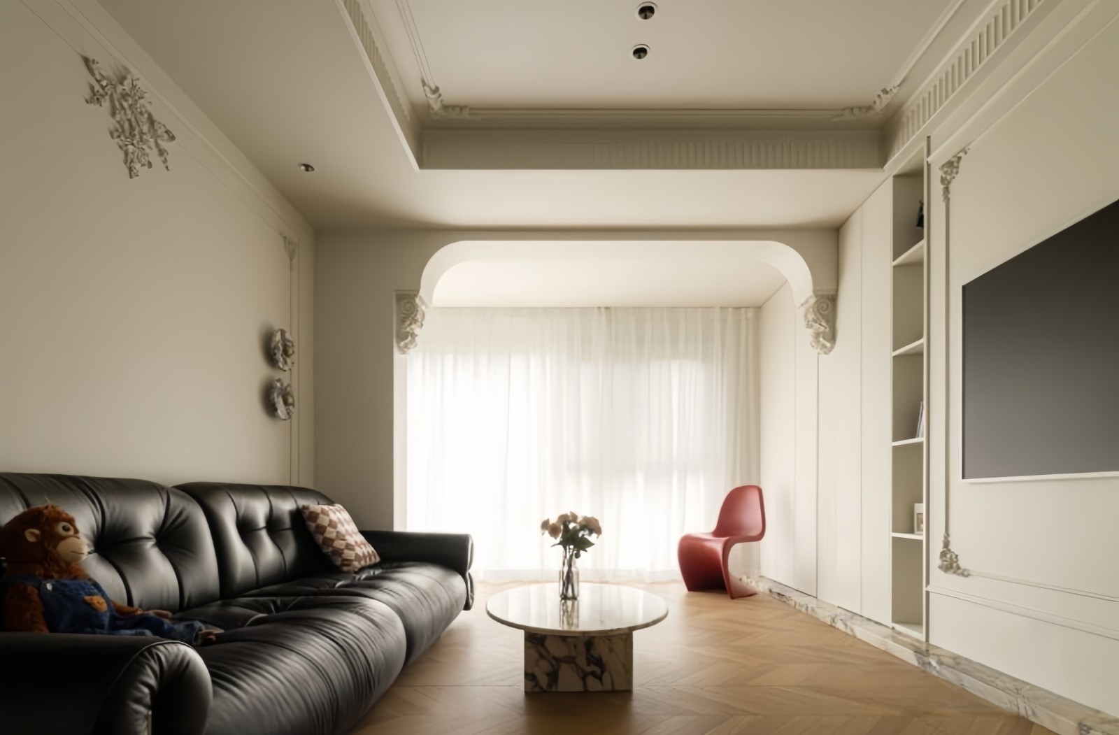 圆弧形的设计是点睛之笔,墙角转角处设计成弧型,弱化了尖锐感,更柔和灵动。配上拱形门、圆弧形的椅背… 柔美优雅,时髦耐看。