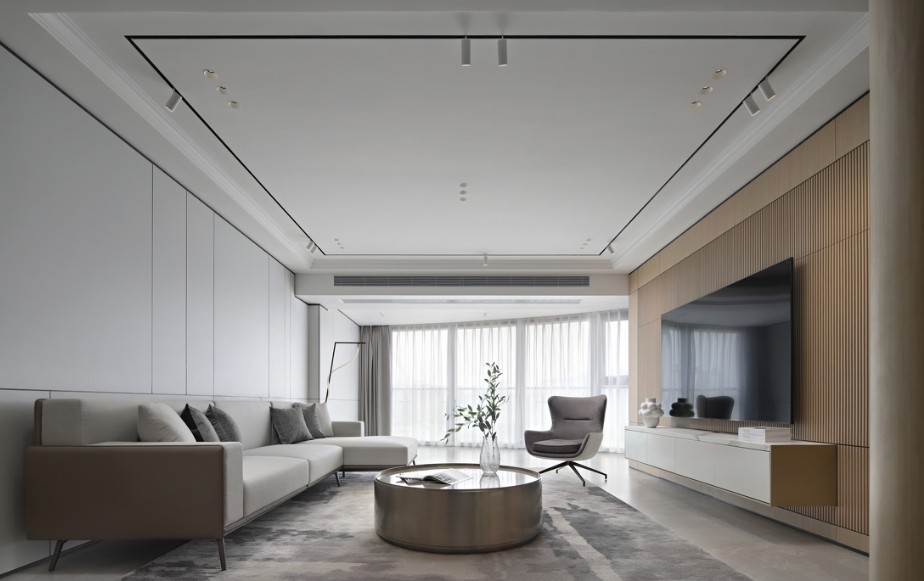 电视背景墙定制了一面的格栅墙雅致别韵,挂壁的电视柜用雅白石材和不锈钢金属相退互碰撞,让整个空间都有个衔接。